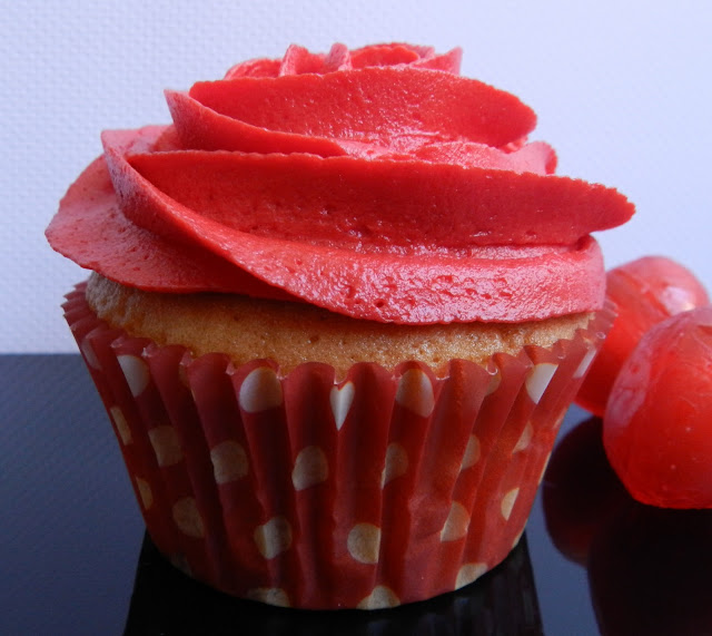 Hice para la base unos cupcakes de vainilla de alma, que rellené con mermelada de cereza, pero sin rellenar ,incluso con mermelada de fresa deben estar estupendos… y el frosting de buttercream con unas 4 o 5 gotas de la esencia de «cereza».