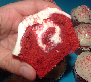 Estos son sin duda mis favoritos con el frosting de queso... ya se salen, he usado la misma receta que uso para la tarta red velvet y rellené los papelitos, Teniéndolo en el horno unos 15 -20 minutos a 180º según horno, deben quedar jugositos.