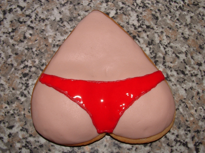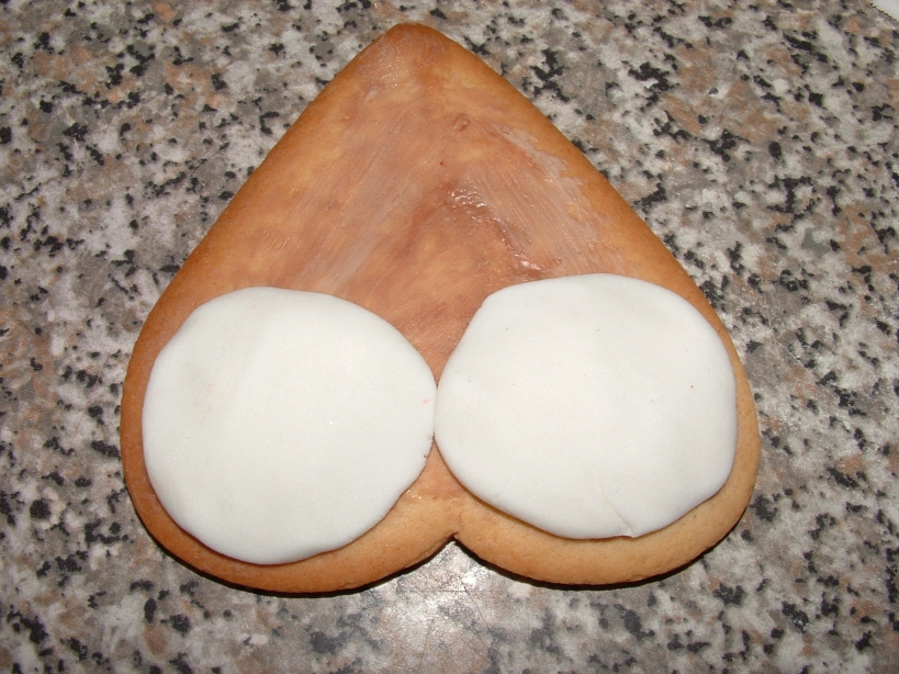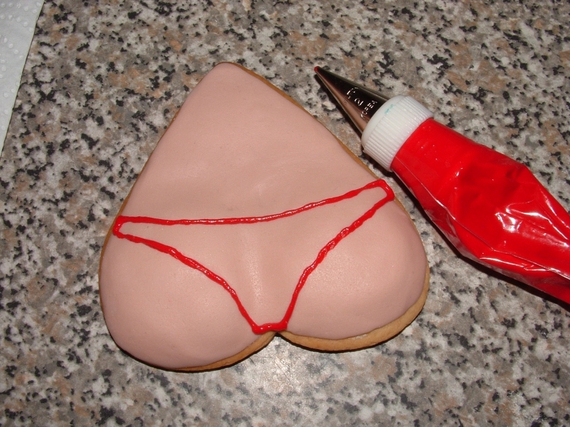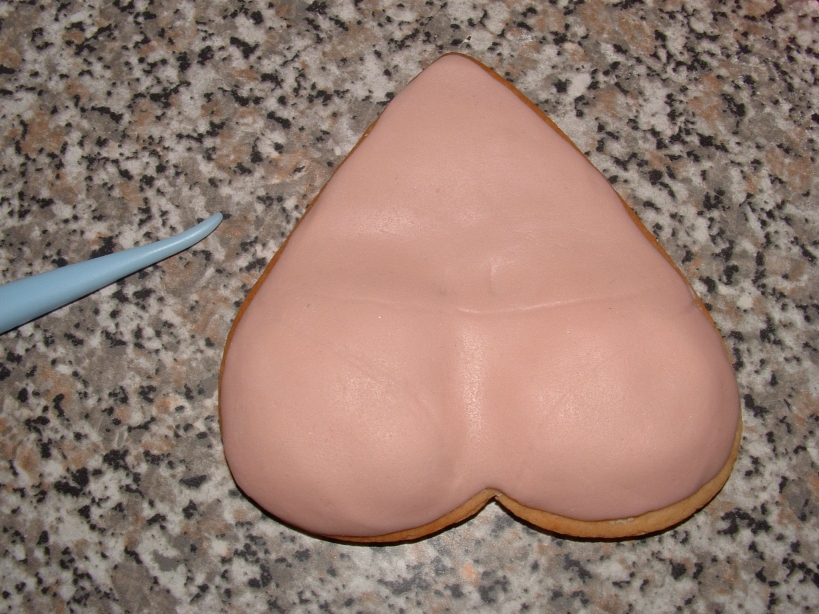 Hacemos el icing o la glasa, primero el contorno y marcamos los huequecillos que se tienen encima de los glúteos y dejamos secar unos minutos: