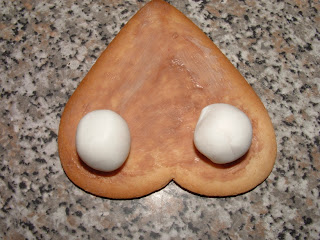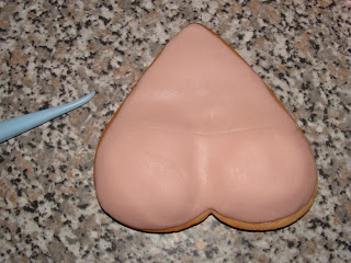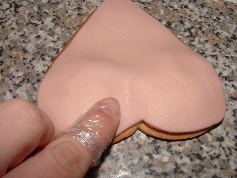 Después cortamos de color de carne de nuevo la forma de corazón de fondant, y de nuevo extendemos con nuestro dedo envuelto en flim transparente y alisamos :